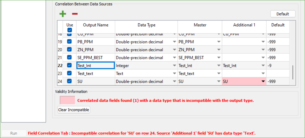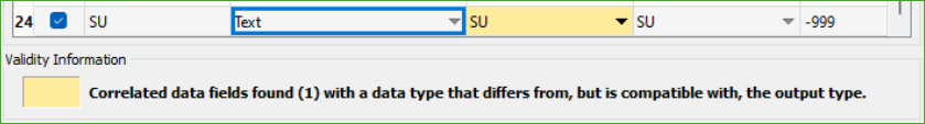 In our example, we have a situation where the field name SU appears in both sources but has incompatible data types: the Additional Source 1 has it as a Text field, while the master source has it as a Double-precision decimal. If this mismatch occurs, an error warning will be displayed as shown below.