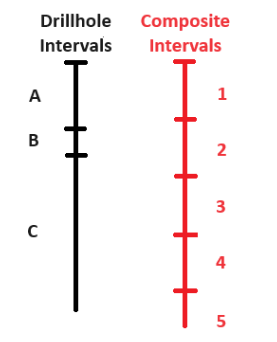 In Samples Manager, composites are calculated using a mass-weighted average, or a length-weighted average if specific-gravity data is unavailable. In simplified terms, composites are created in GeologyCore as sample point-sets, with one point for each composite interval. These points include composited grade (assay) values and additional attributes such as hole composited, thickness, top and bottom intercepts, etc. These point-sets can be exported as composite databases for use in Vulcan and the Vulcan Data Analyser (VDA).