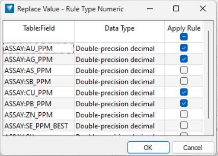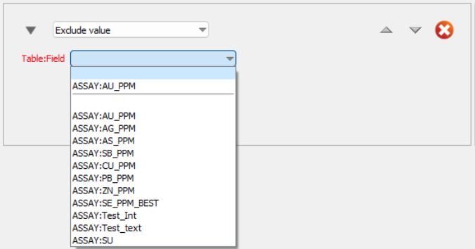 From the drop-down list of table names in the database, select all tables that contain grade data. For example, in the database, the GEOLOGY table may be selected for grade/assay values.