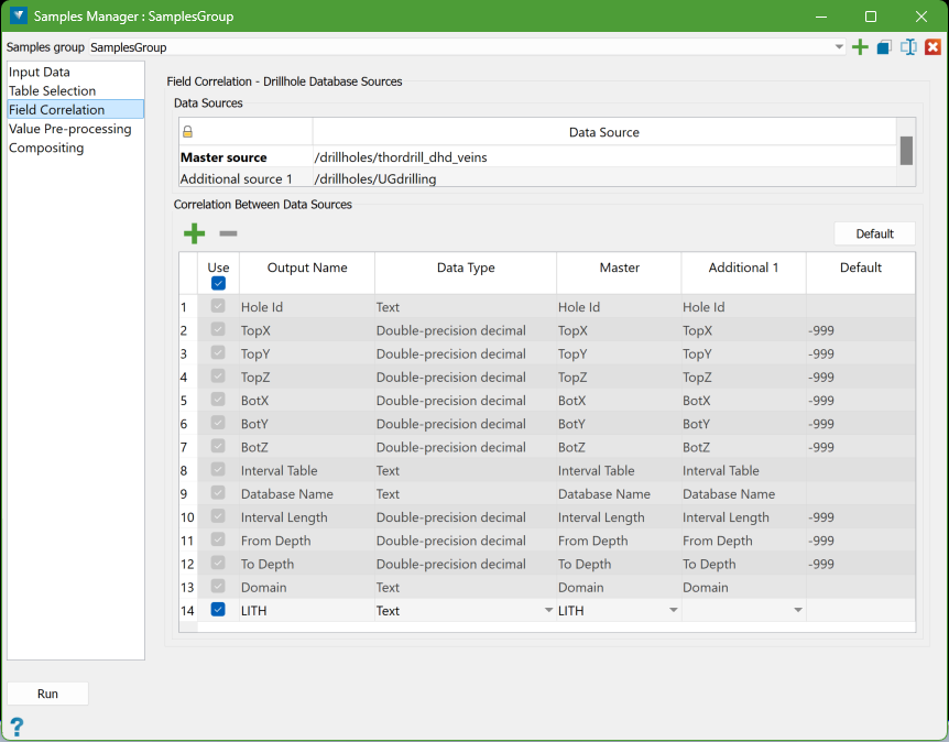 The Field Correlation tab displays the attributes that will be added to the composite points and allows the user to adjust how variables are correlated between different data sources. This means matching variables from the grade (assay) table of additional sources with those from the Master source. The auto-correlation tool will attempt to match variables by name, but user adjustments may be necessary if inconsistent naming has been used, such as when working with older, historical data.