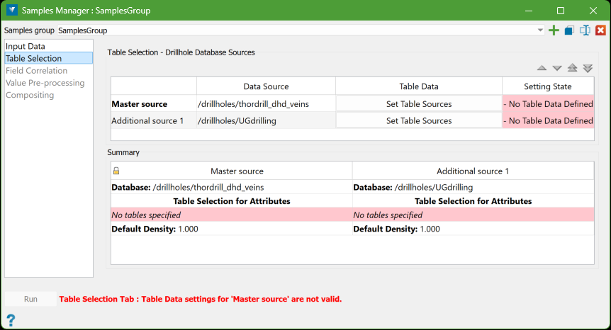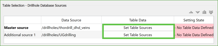 After selecting to use a Drillhole Database(s) on the Input Data tab, the Table Selection tab will display a data grid showing the source databases. Each row in the data grid has an action button labelled Set Table Source, which you can click to specify the tables and/or LAS files that will provide the grade (assay) data for compositing.