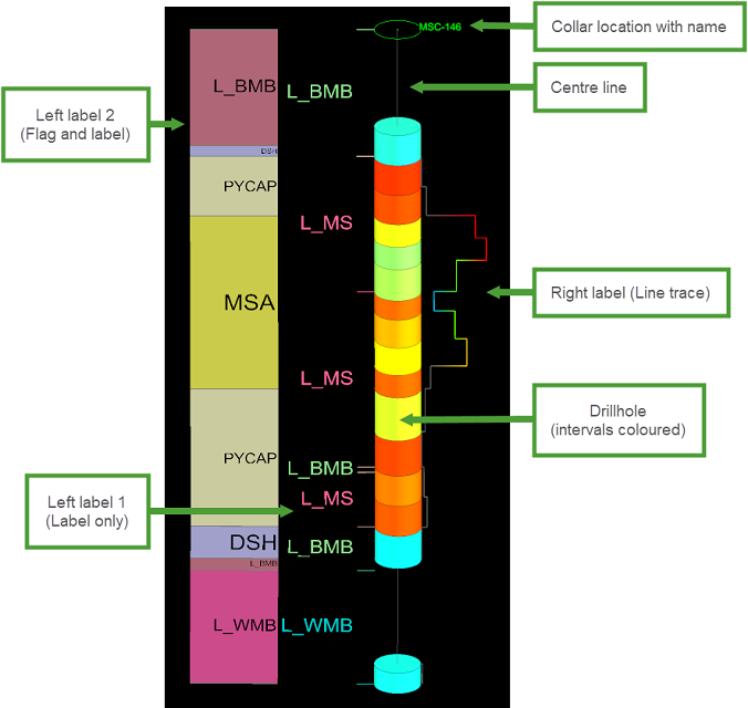 A left or right label adjacent to the drillhole, coloured according to a legend. Various label visualisations are possible, depending on the field type, including text labels, line traces and “flags”.