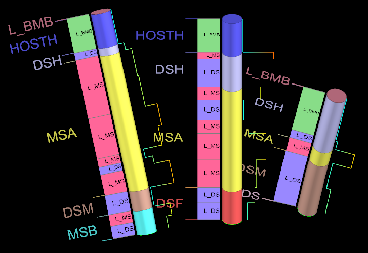 The drillhole itself represents an assay field, where each interval is coloured according to a numeric legend. The drillhole is given a nominal diameter of 1 m to show the intervals clearly. The centre line shows the drillhole trace for missing intervals for that field.