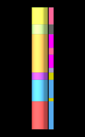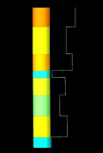 A drillhole with intervals—visualised as a sequence of cylindrical objects given a nominal diameter in space, coloured according to a legend.