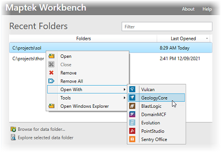 Alternatively, under Recent Folders, right-click on a data folder and navigate to Open With >