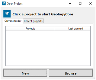 All data you work with in GeologyCore is represented in a project. When you first launch GeologyCore from a Vulcan project folder, a GeologyCore project is automatically created for you. If your data folder is not a Vulcan data folder, you will be prompted to open or create a new GeologyCore project.