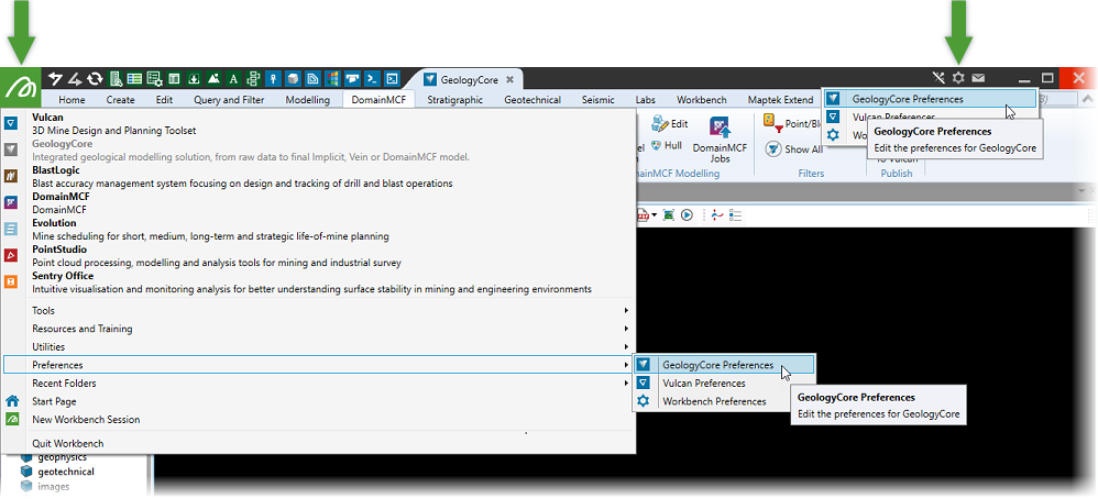 To configure application preferences, such as units, coordinate systems, and view window defaults, navigate to GeologyCore Preferences from either the Maptek launch button