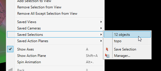 In a view window, right-click on an empty region and navigate to Saved Selections >