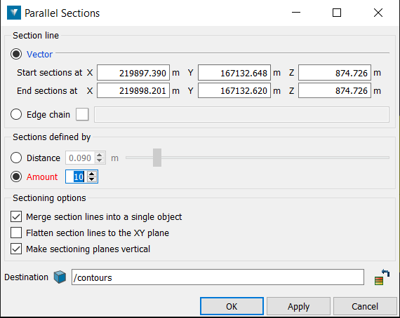 Untick the Make sectioning planes vertical check-box to create the sections in the plane selected in the Start and Stop sections at fields.