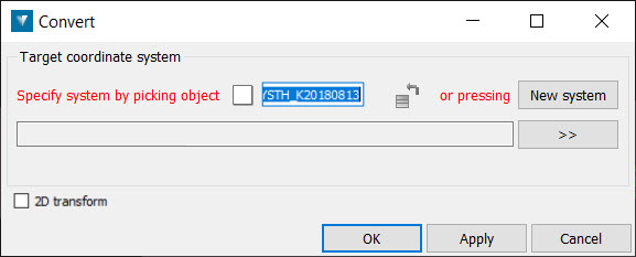 Specify a coordinate system either by automatically transferring the coordinate system applied to another object. To transfer a coordinate system automatically from another object, give focus to the Specify system by picking object field, then either: