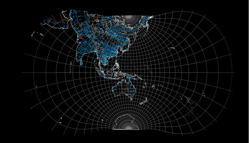 The image below shows a geographic graticule (in grey) which has been transformed from a geographic representation to WGS84 / UTM zone 54S using the Convert tool.
