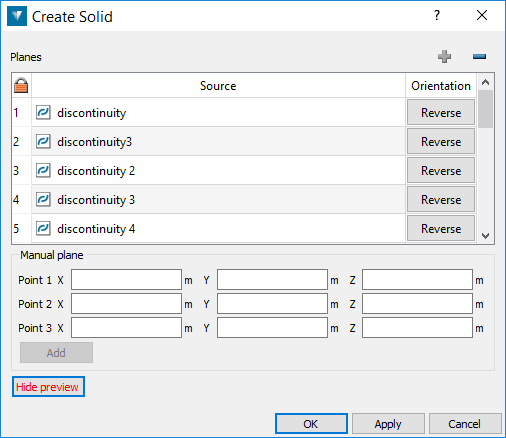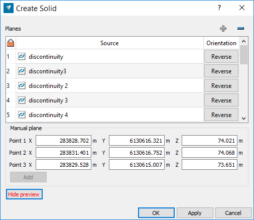 Define Manual planes by clicking in the data field for a point then selecting points around the rock wall where external planes of the solid intersect. You can also manually input numerical values for the coordinates of the points. Click Add to add the plane to the Source list for the solid. A preview visualisation of the solid will be updated.