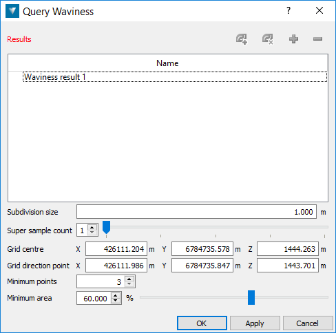 Waviness in discontinuity analyses is concerned with repeating features of flat and steeper areas perpendicular to the slope in the dip direction (forming a wavy pattern), and effectively providing greater resistance to sliding than a totally flat, steep face. The Query Waviness tool provides a means of examining and quantifying the roughness of a section of discontinuity, particularly with respect to the waviness of the roughness. The process involves subdividing the section into nominated sized patches or cells for a statistical analysis of waviness plunge and trend, as well as overall discontinuity dip, dip direction and strike. A series of cross sections through the region help to visualise and identify any wave-like patterns. The results can be saved in a PDF document.