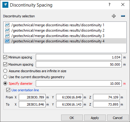 Use orientation line — If an orientation line is specified then spacing will be calculated as the distance between discontinuities at the location they intersect the orientation line. Without an orientation line, spacing will be calculated based on the mean discontinuity orientation. Enter coordinates directly into the fields on the panel or select the field(s) and click in the view window where you want to define the orientation line.