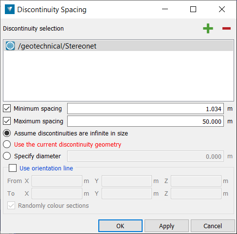 Go to Geotechnical > Analyse > Spacing. This will open a new panel. Add existing discontinuity sets and/or individual discontinuities to the Discontinuity selection list by selecting and clicking the plus symbol or middle click and drag into the box. Remove an entry by selecting and clicking the minus symbol.