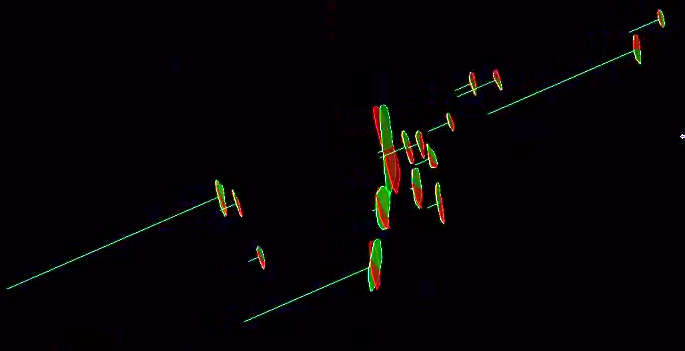 | Original discontinuities (green) displayed overlapping their mean-orientation equivalents (red). The green (perpendicular) lines represent the spacings between discontinuities. | |