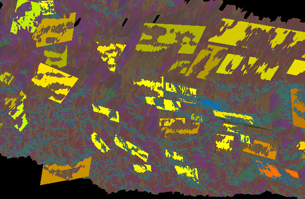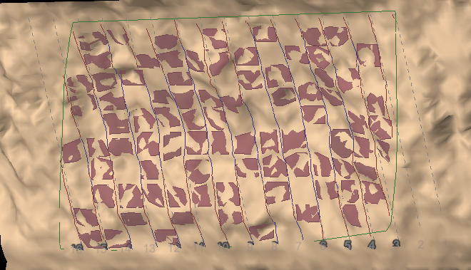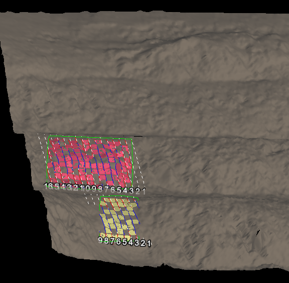 Click the plus symbol to add any selected areas to the Name list. As you add the area of interest, the tool will generate images and display a message. You can continue to add more areas, if desired. Use the minus symbol to remove entries. The remaining two symbols can be used for grouping areas into discontinuity sets, or ungrouping them. Reports are produced for each area showing a histogram and cross sections. These make up the content for saving to PDF files if you choose. At this stage you can view the cells arranged on the surface of the areas under investigation, in more detail. All objects and elements making up the cell analyses are saved in the Geotechnical container.