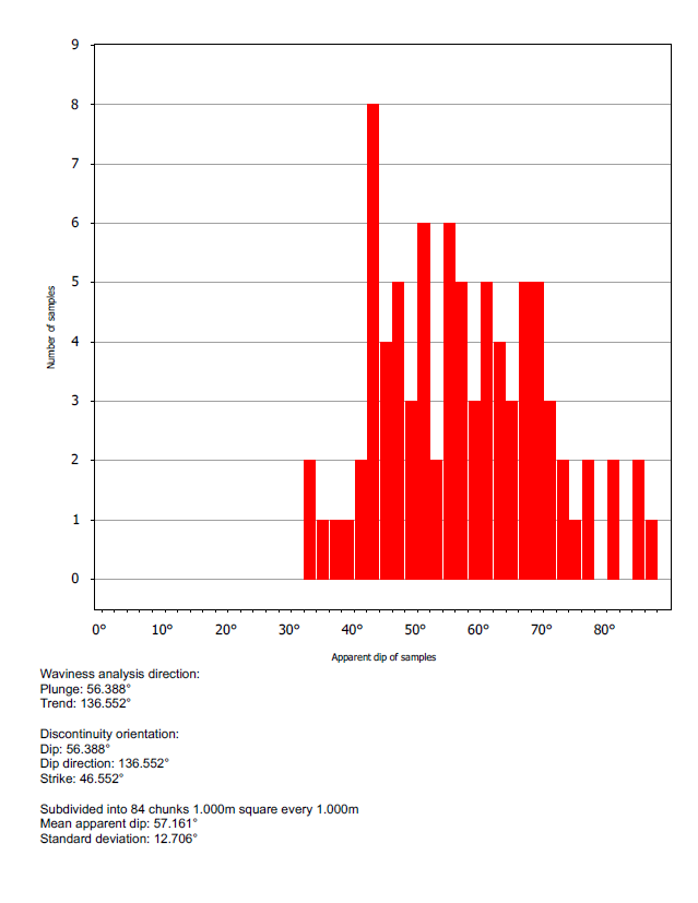 The second page presents a histogram of the apparent dip of the individual sampling cells used to break down the rock face under investigation. There is also a summary of statistical data drawn from the analysis.