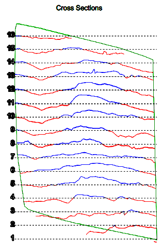 The third page displays cross sections which are taken vertically through the face and rotated left 90 degrees on paper, then displayed above and below each other in sequence from the original right to left (= top to bottom). The spacing of the cross sections is related to the subdivision size. The colour of the cross section line helps to identify whether the line is above (blue = further out) or below (red = closer in) the mean for that section.
