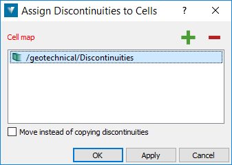 Discontinuities are assigned to cells that contain them when superimposed in 3D space. The result is that individual discontinuities appearing within a cell will be either copied or moved to the cell object itself.