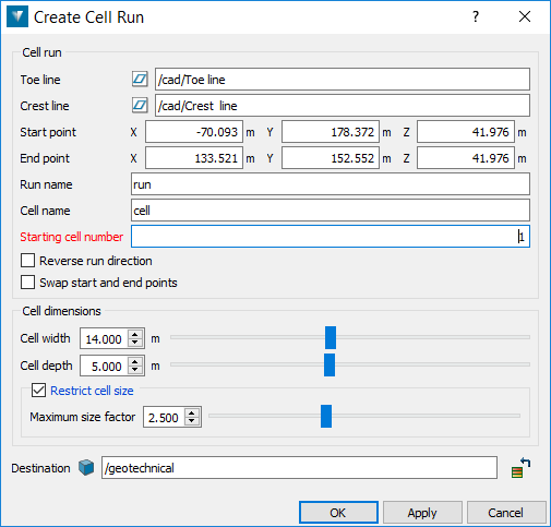 - Restrict cell size. Choose whether cells will be created between the crest and toe line if they are larger than the cell width and depth multiplied by the Maximum size factor.