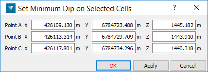 Allows the user to set a minimum dip value for a cell. The user enters values or selects three points on the pit wall or surface that represent the plane of the minimum dip value. This quantity and others can be retrieved using the Cell Map Report function.