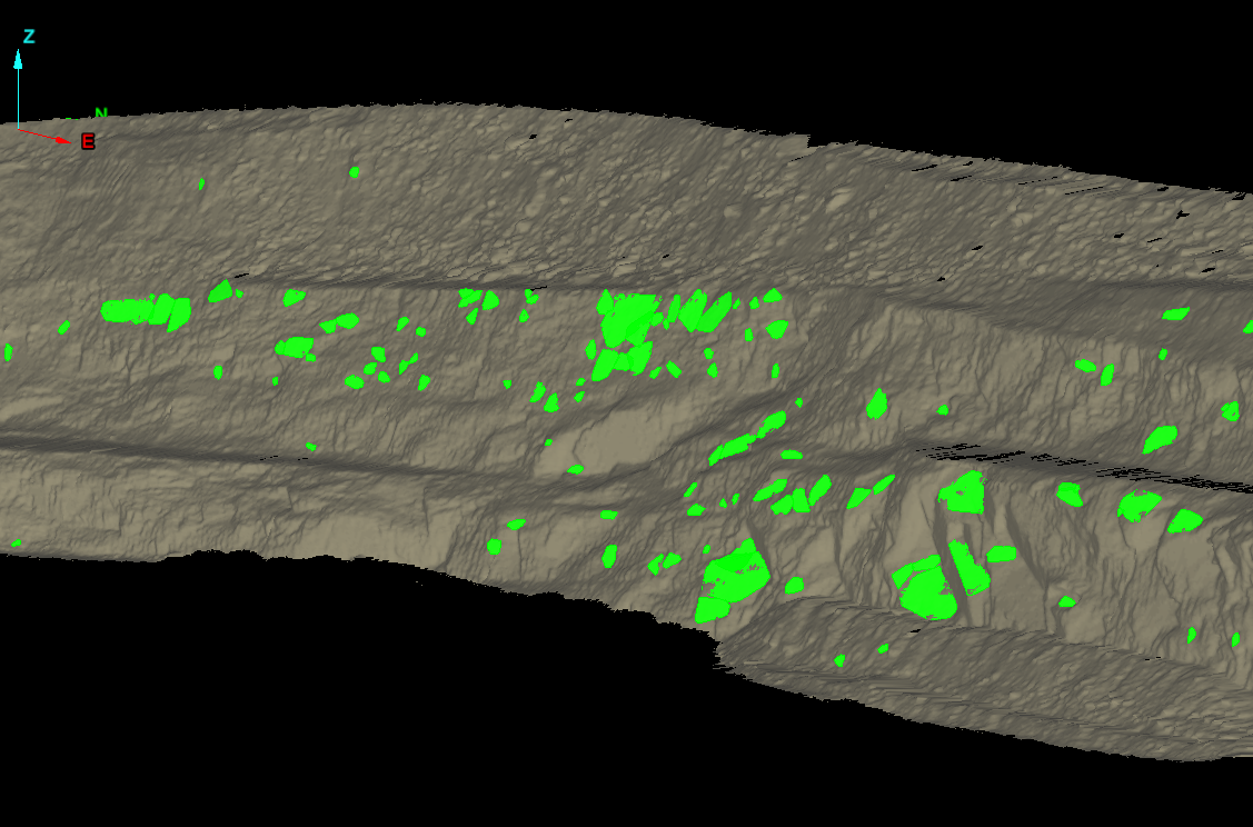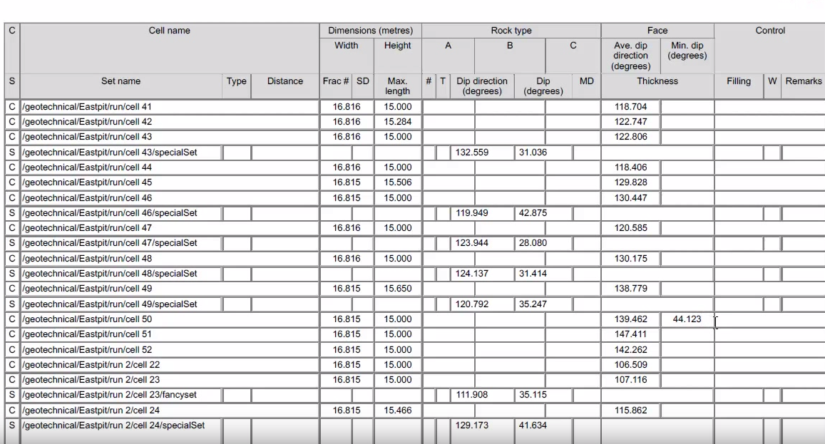 This function uses the section of pit face or wall contained within a cell to calculate a mean face orientation. The mean orientation value is then assigned to the cell. This quantity and others can be retrieved using the Cell Map Report function.