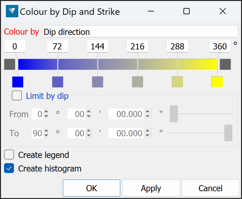Set Colour by from the drop-down menu to Dip, Strike or Dip direction.