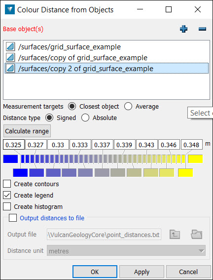 Select Signed distance to separate colouring depending on whether the selected data is above or below a base surface (or Absolute distance otherwise).