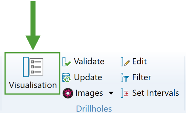 The Drillhole Visualisation tool can be found in the Modelling, DomainMCF and Stratigraphic ribbons under the Drillholes section.