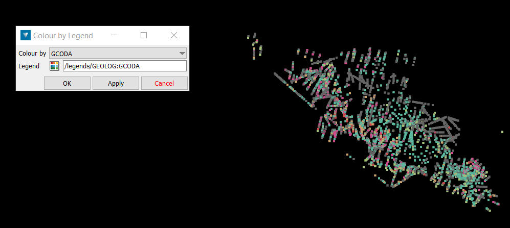 The resulting legend may be used to colour by legend for data such as drillhole assay or quality data (e.g. gold grade, ash %). Numeric legends may also be used to colour by height for surfaces and for various point attributes in geophysical data, such as airborne gravity or magnetics surveys.
