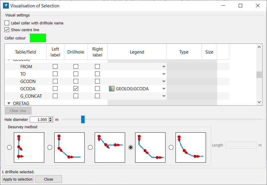 Desurvey method — Choose a visualisation mode for the selected drillholes. The default and recommended desurvey method is Tangent.