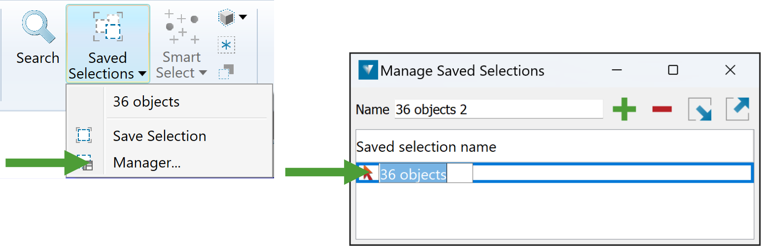To rename a selection, go to Home > Selection > Saved Selections > Manager. Double-click the saved selection name and enter a new name.