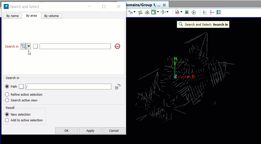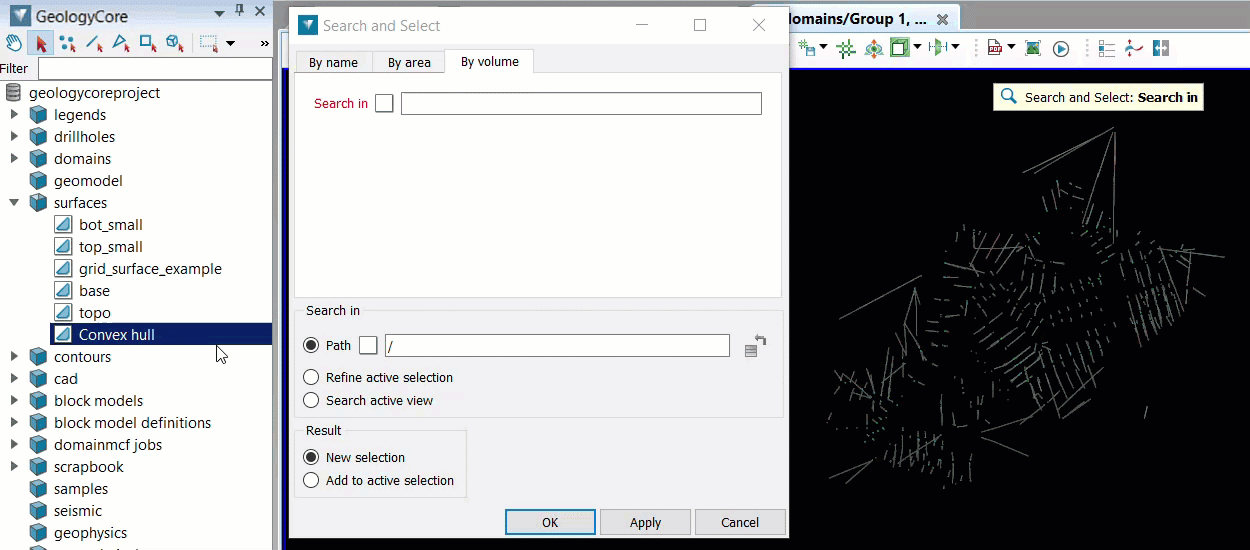 By volume — Drag and drop a closed solid (e.g. a convex hull) into the first Search in field.