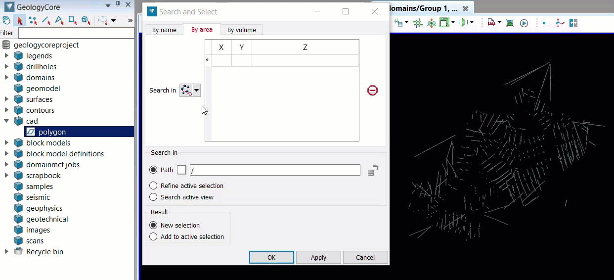 Refine active selection — Use this option if you want to search for an object from a selected number of drillholes in the view.