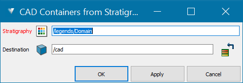 Select the Destination container under which to place the stratigraphy CAD container hierarchy. This will create a root container of the stratigraphy name within which will be placed the hierarchy of the containers representing that stratigraphy.