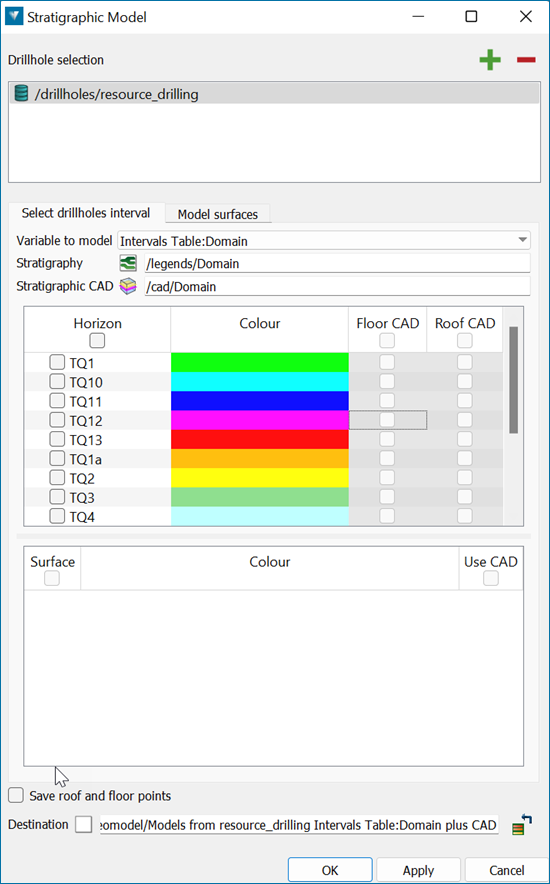 A panel will open with two input tabs — Select drillholes interval and Model surfaces.