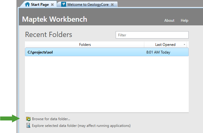 Maptek Workbench allows you to set a folder containing your project data as the data folder. When GeologyCore looks for files on the file system, it will look in this folder.