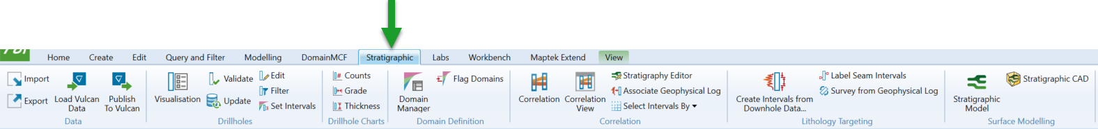All the main tools you need to generate and publish geological models are presented on the Modelling, DomainMCF and Stratigraphic ribbon menus.