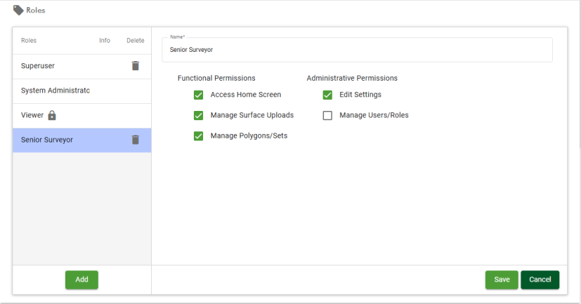 Individual users can have various roles assigned to them to restrict or enable access to various features. For example, to view and query the model you need to be assigned a role with the Access Home Screen permission, and to upload new source surfaces you need to have the Manage Surface Uploads permission. At least one user with a role that enables the Edit Settings permission must be defined to allow the other settings to be configured. You can either use the predefined Superuser role for this purpose, or define a new named role that enables this permission.