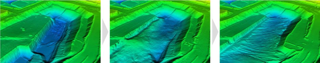 When new as-built surfaces are imported, they are merged into the combined model. The combined model viewed at any given time typically includes data from multiple surfaces acquired at different times. Where these surfaces overlap, newer data always take precedence over older data.