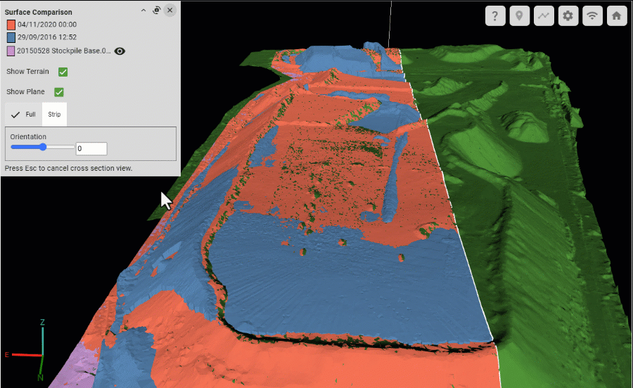 Surface Comparison tool allows you to view the parts of the surface behind an intersecting vertical plane. You can opt to display the surface at a single point in time, or compare the surface between two points in time.