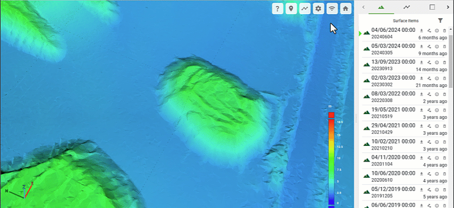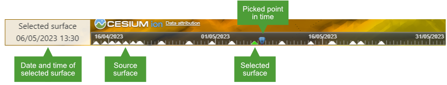 Click on the timeline to pick a point in time and select the closest source surface. A blue position marker indicates the point in time that was picked. The date and time of the selected surface are shown in the bottom-left corner of the view. The viewer will automatically update to show the combined as-built at that point in time.