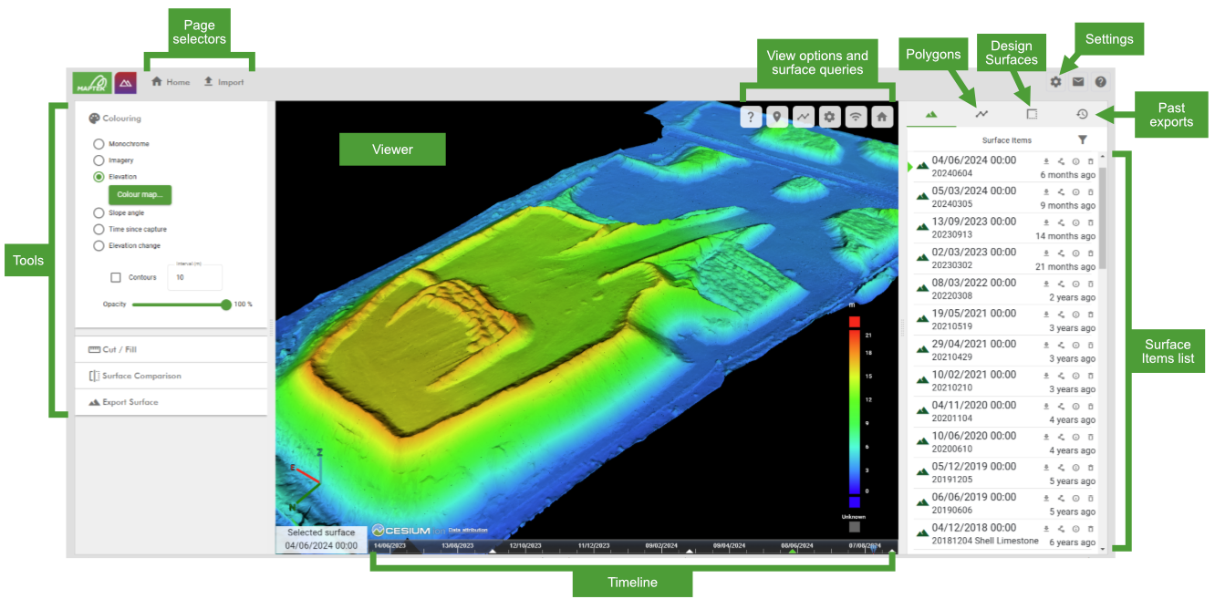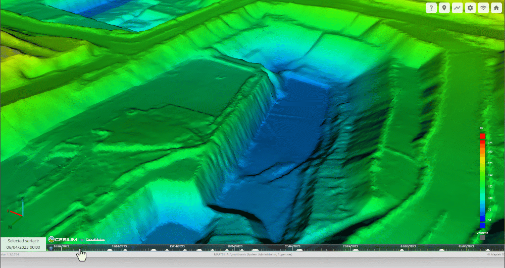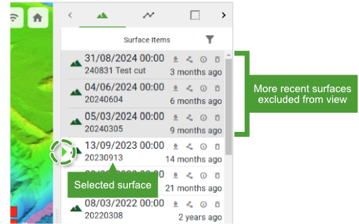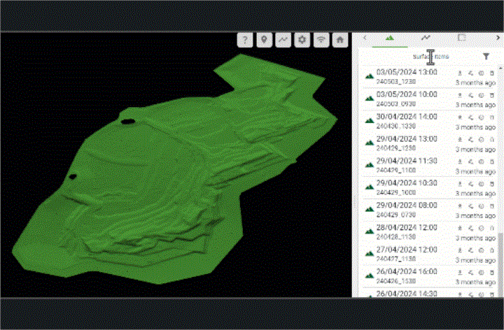 GeoSpatial Manager can display the combined as-built surface for any point in time between the oldest source surface and the most recent source surface. The timeline located at the bottom of the viewer represents each uploaded source surface with a triangle. The green triangle represents the currently selected surface. The surface in the viewer is a model that combines each source surface from the oldest to the selected surface.