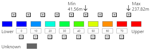 Interval picker Configure the colour map intervals using the interval picker. The range of values for intervals should be appropriate to the type of data to be coloured and the expected data value range. The Elevation colour map tool displays the minimum and maximum elevations of the surface (see Min and Max in the image below).