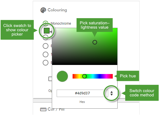 Adjust the colour as desired using the hue slider or saturation–lightness picker.