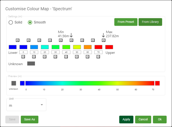 Select unit From the Unit drop-down, select the unit for the colour map. This unit will be displayed on the legend in the view.