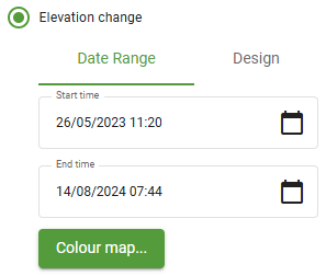 - Select the Date Range tab and configure the Start time and End time fields to define the period of time over which to calculate the elevation change.