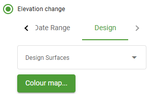 The Elevation change colouring option colours the surface by the change in elevation over a given time period or the deviation from a design surface, according to a configurable colour map. This colouring option is useful to quickly visualise which parts of an operation have been subject to the most activity.