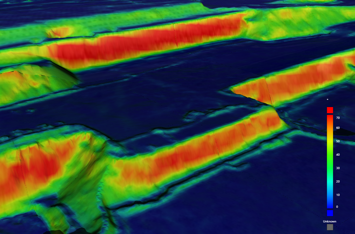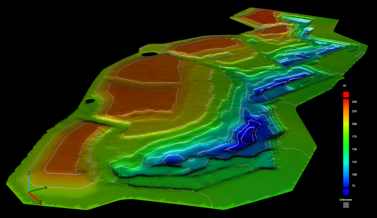 The Time since capture colouring option colours the surface by the age of the most recent source surface contributing to each part of the combined surface according to a configurable colour map. This is particularly useful to quickly identify which parts of the surface have not been updated recently and may require resurveying.